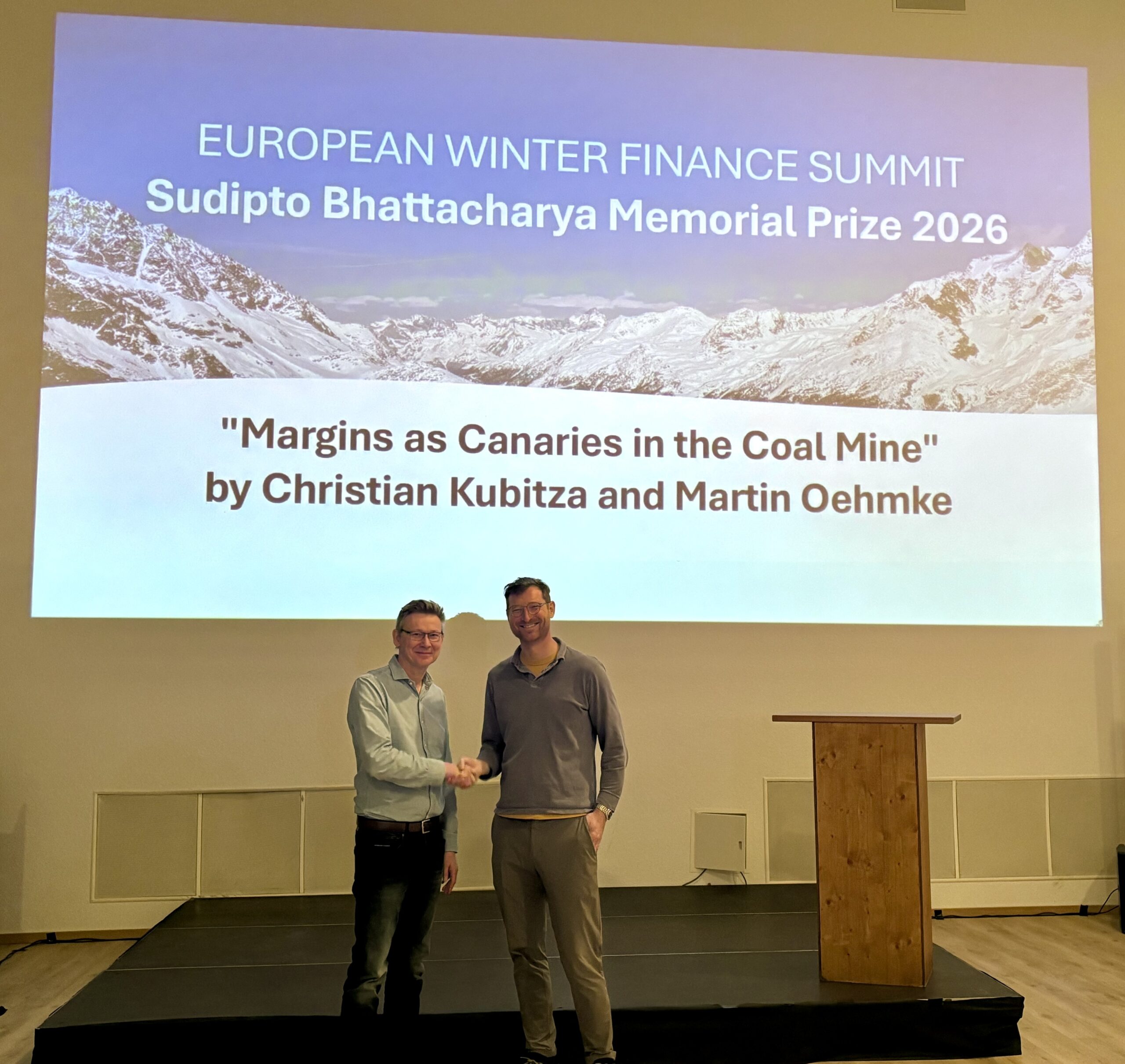 Martin Oehmke from the London School of Economics and Political Science (LSE) received the award at the European Winter Finance Summit 2026 for the paper “Margins as Canaries in the Coal Mine” (by Christian Kubitza & Martin Oehmke).